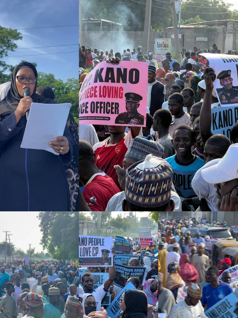 The banners they are carrying are inscribed with “CP Kano must stay” “Kano People Love CP” “Kano Governor Abba Kabir Yusuf Leave CP alone” and other slogans.